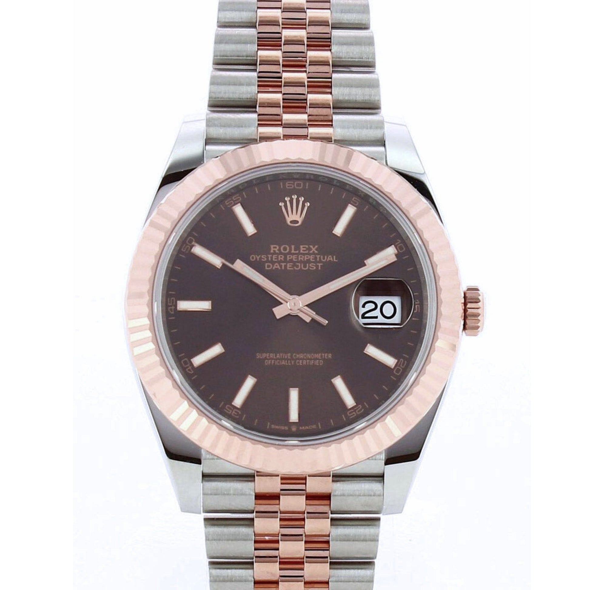 Brand New Full set, Year 2025. This Datejust has a rose gold and stainless steel case with a rose gold and stainless steel Jubilee bracelet. Fixed bezel. Chocolate dial with silver tone hands and index hour markers. Date display at the 3 o\'clock position. Scratch resistant sapphire crystal. Rolex Calibre 3235 Automatic movement has a power reserve of 70h.