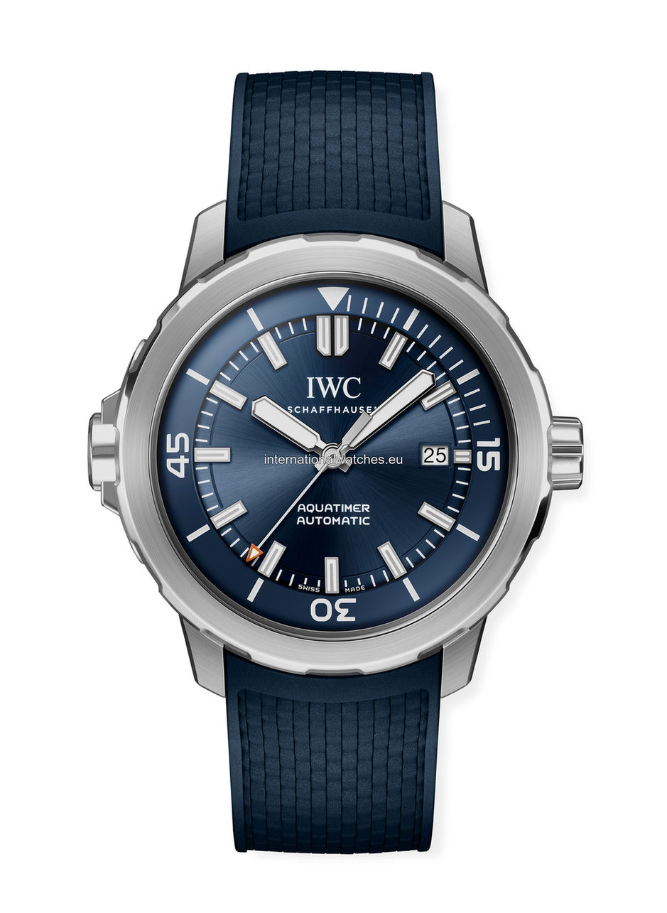 A robust construction, high pressure resistance, easy readability, and innovative technical functionality: these are the key features of the Aquatimer dive watches IWC has been engineering since 1967 and that are used by both professional and recreational scuba divers. The Aquatimer Automatic is a dive watch water-resistant to 30 bar in a 42-millimeter case made of corrosion-resistant stainless steel. The diving-relevant indications on the blue dial are coated with luminous material to ensure optimum legibility under water. At work inside the case is the IWC-manufactured 32111 caliber, which features automatic winding and a power reserve of 120 hours. The innovative external/internal rotating bezel combines ease of use with safety. The rotation of the external bezel is transmitted via a sliding clutch system to the internal bezel. The SafeDive system ensures that the inner ring with the dive time scale always rotates counterclockwise. Therefore, even in the event of an unintentional adjustment, the dive time can never be extended, and the diver's safety is guaranteed at all times. Thanks to the IWC quick-change system, the blue rubber strap can be exchanged for another bracelet effortlessly.