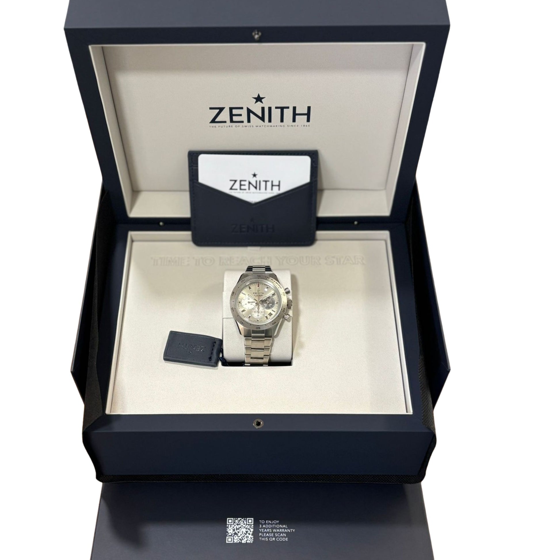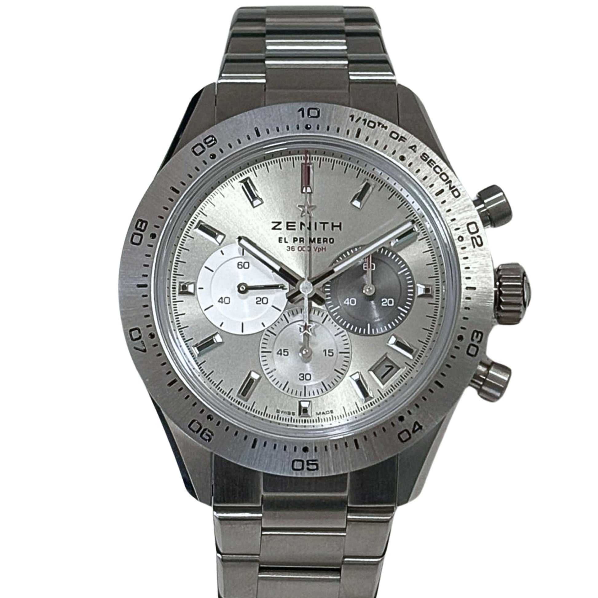 The CHRONOMASTER Sport is crafted in a 41mm titanium case with a brushed titanium bezel, paired with a nickel-grey sunburst tricolour dial and a titanium bracelet. Powered by the El Primero 3600 automatic high-frequency chronograph movement with 1/10th of a second chronograph function and a power reserve of 60 hours.