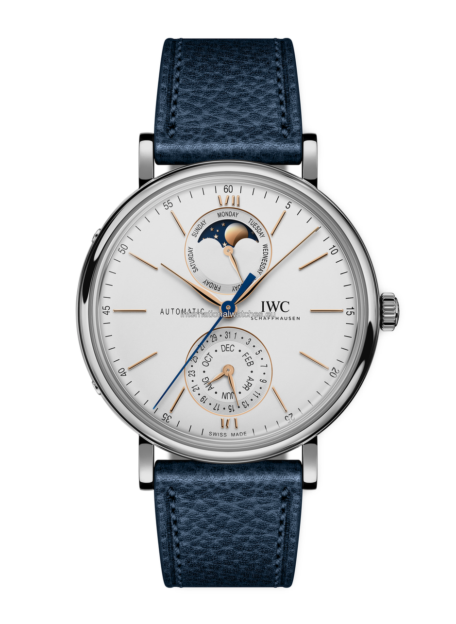 The day of the week, date, month, and moon phase, all displayed conveniently on the dial: The Portofino Complete Calendar is the first timepiece from IWC to feature the newly developed complete calendar module. This version features a stainless steel case with a diameter of 41 millimetres, a silver-plated dial, and gold-plated hands and appliques. A subdial at 6 o’clock displays the date and the month, while the day of the week and the moon phase can be read of in the subdial at 12 o’clock. The calendar module consists of 123 individual part and is mounted on the IWC-manufactured 32150 calibre. Each of its displays is driven by a separate gear train and can be set independently of the others via the crown or using two push-pieces integrated into the side of the case. The complete calendar only needs to be adjusted in months that have less than 31 days. On the last day of the month, the date indicator must be advanced to the position 31 via the crown. Around midnight, all displays will then automatically advance by one day. Elaborately finished with a gold-plated rotor and blued screws, the movement can be admired through the sapphire glass back. This timepiece is fitted with a blue calfskin strap with a butterfly folding clasp.